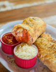 Massa paganini, frango, queijo mussarela, queijo parmesรฃo e orรฉgano.